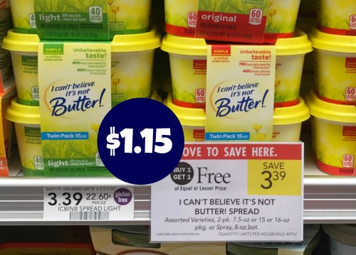 I Can't Believe It's Not Butter! items are JUST $1.79 each at Kroger! They'll be $2.29 at Kroger when you head to the store. Make sure to take your $1.00/2 I Can't Believe It's Not Butter! insert coupon (below) so you can get these for JUST $1.79 each! [pl-deal id='554014′] [pl-title]I Can't Believe It's Not Butter! Spread (15 oz) and Spray (8 oz) - $2.29 (wyb 5 or more participating items thru 1/11) [/pl-title]